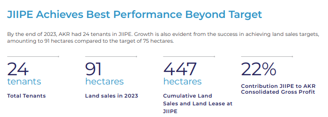 Hingga 2023 lahan industri AKRA yaitu JIIPE dihuni 24 tenan (91 ha) berkonturibusi terhadap gross profit AKRA sebesar 22%.
