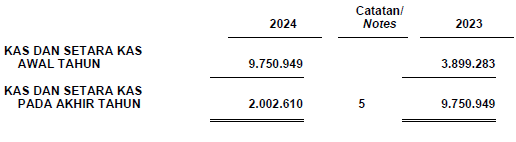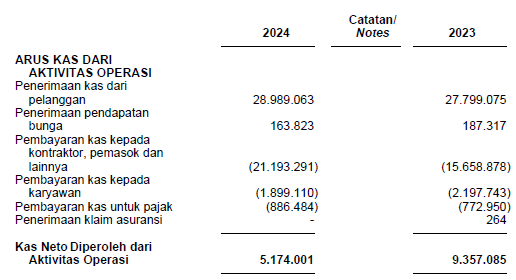 Pada bagian arus kas, penerimaan kas dari pelanggan tahun 2024 lebih tinggi dibandingkan tahun 2023, sebagian karena receivable yang berhasil ditagih. Pembayaran kepada pemasok naik dari 15 juta USD menjadi 21 juta USD. Secara keseluruhan, arus kas dari operasi turun dari 9,3 juta USD menjadi 5,17 juta USD akibat peningkatan pembayaran kepada pemasok.