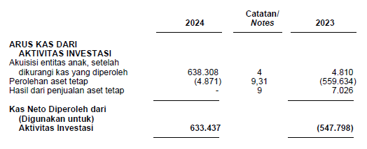 Arus kas dari investasi menunjukkan penambahan sebesar 638.000 USD pada tahun 2024 dibandingkan dengan hanya 4 ribu USD pada tahun 2023, yang merupakan peningkatan signifikan. Perusahaan juga mencatat perolehan aset tetap sebesar 4,871 USD, jauh lebih kecil dibandingkan tahun sebelumnya yang tercatat 559 ribu USD. Hal ini bisa jadi terkait dengan aset energi terbarukan yang kepemilikannya berada di tangan PLN setelah selesai pembangunan.