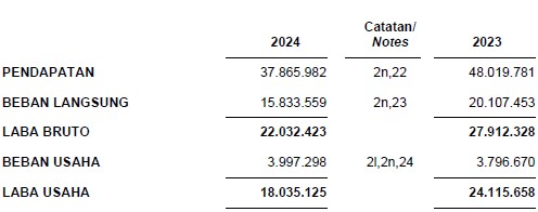 Meski pendapatannya menurun, margin perusahaan tetap stabil. Penjualan tahun 2024 adalah 37 juta USD dengan beban sebesar 15,8 juta USD, menunjukkan margin yang tidak berubah dibandingkan tahun sebelumnya. Meski begitu, laba usaha turun drastis dari 24 juta USD menjadi 18 juta USD.