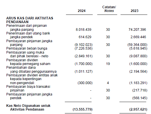 Pada 2024 perusahaan menarik pinjaman sebesar 8 juta USD, sedangkan pada tahun 2023 di mana ia menarik 74 juta USD. Pengeluaran sedikit dilakukan dan pembayaran sebesar 9 juta USD, serta beban bunga 7juta USD juga tercatat. Pembayaran dividen kepada pemilik sahamnya sebesar 1,7 juta USD dilakukan, meningkat dari 1,6 juta USD pada tahun sebelumnya.