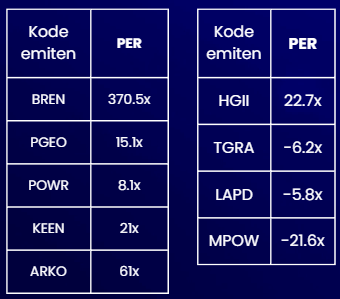 PGEO masih baru IPO, mungkin perlu waktu untuk mengenal emiten tersebut. Dan emiten yang PER nya negatif, berarti mereka belum mencetak laba, mungkin karena biaya dari hutang atau aset. Sebagai investor, saya lebih fokus pada perusahaan yang sudah menghasilkan laba karena ini membawa dividen atau kenaikan saham.