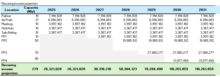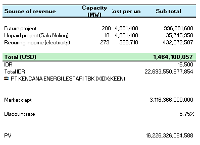 Mari kita hitung pendapatan berulang (recurring income) dan proyek yang akan dibangun. Saat ini, perusahaan memiliki 65 MW yang sudah berjalan, serta 200 MW lagi yang akan datang. Kita bisa memperkirakan pendapatan dari listrik dengan melihat biaya penerimaan dari setiap megawatt yang mereka bangun. Dengan asumsi harga rata-rata proyek pembangunan pembangkit listrik terdahulunya,maka pendapatan Kencana Energi dapat diprediksi.