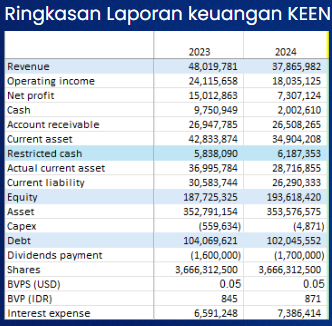 KEEN merupakan perusahaan energi terbarukan yang fokus pada pengembangan dan pengoperasian perusahaan listrik energi baru terbarukan (EBT). KEEN saat ini memiliki 65MW lokasi pembangkit listrik dan akan ada 200MW yang akan dibangun. Dengan perkiraan 200MW selesai dibangun dan difungsikan, valuasi KEEN wajarnya 22T. Dengan harga pasar sekitar 2.7T, valuasi KEEN tergolong undervalue.