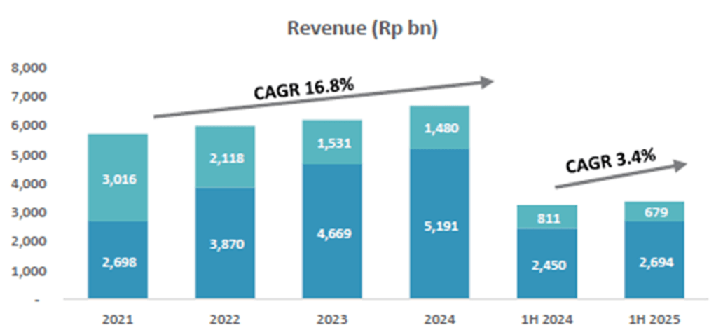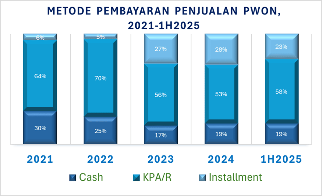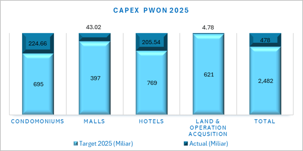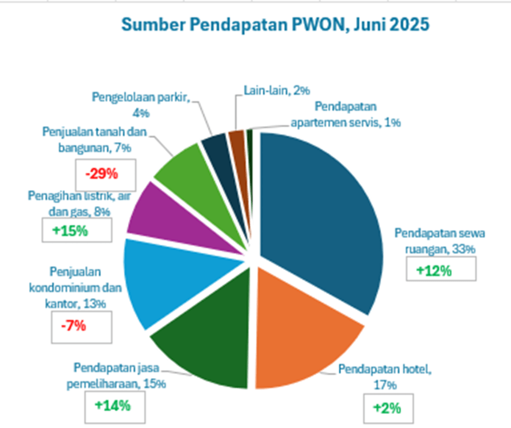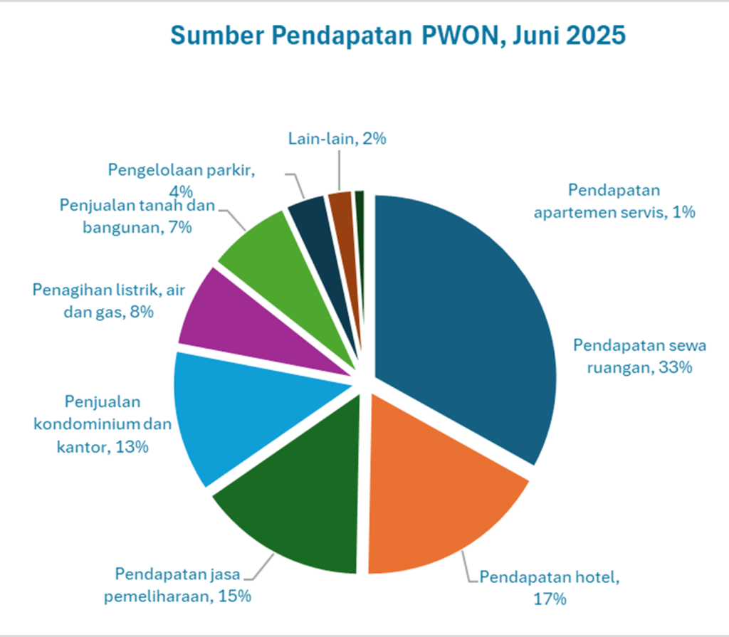 Hingga Juni 2025, PWON mencatatkan pertumbuhan yang solid pada sumber pendapatan berulangnya, namun sumber pendapatan dari penjualan lahan dan unit apartemen +kantor terlihat mengalami kontraksi hingga susut 29%.