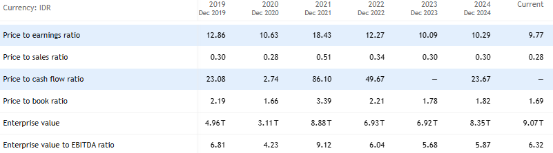Investor dapat melihat pergerakan rasio price-to-earning (PER) perusahaan yang kini turun menjadi 9,69 dari sebelumnya 10,29, bahkan sempat mencapai 183 pada tahun 2021. Meski pendapatan terus meningkat, PER menurun karena net margin tidak mengikuti pertumbuhan revenue, sehingga investor kurang puas dengan kinerja perusahaan.